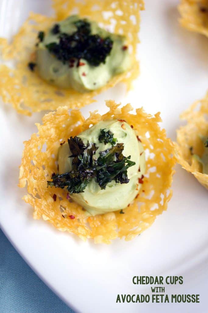 These Cheddar Cups with Avocado Feta Mousse are the best ever appetizer. The cheese cups require one ingredient and the entire appetizer is so easy to put together!