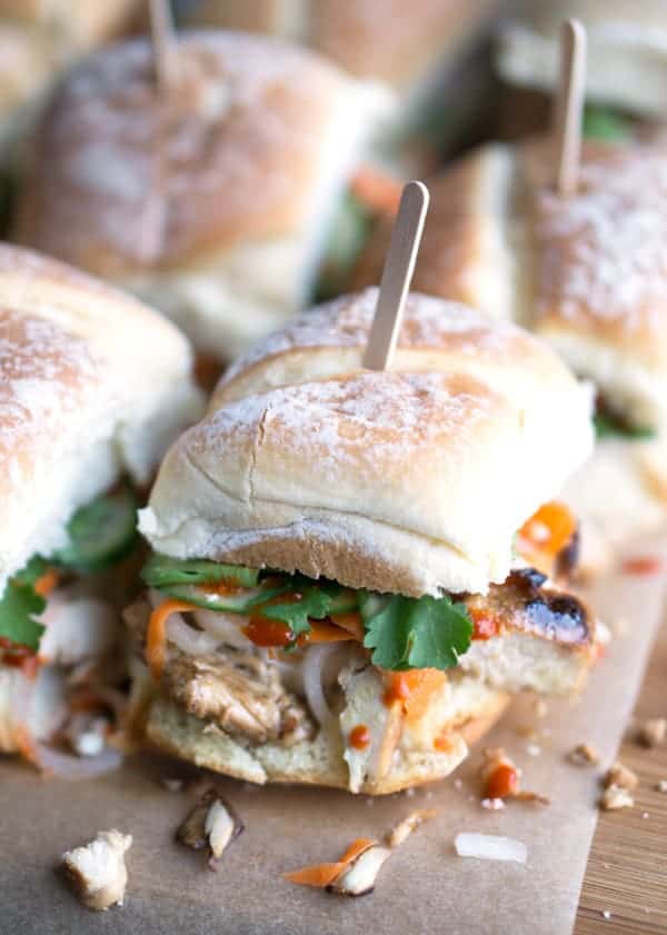 Banh mi is a scrumptious Vietnamese sandwich that hits ALL flavors of the palate. This slider piles grilled chicken, fresh veggies, and quick-pickled veggies on slider rolls. They are the perfect handheld appetizer people will love!