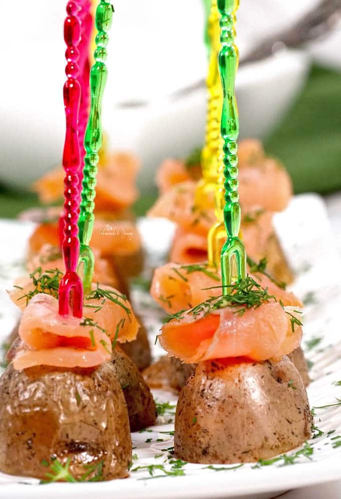 Elegant and easy, these smoked salmon potato skewers are always a hit at parties. Sour cream and dill sauce perfectly pairs this tasty appetizer.